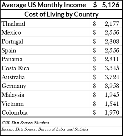 By comparison, the US cost of living before taxes is nearly double the cost of living for a comfortable family of four living in most of the top 10 expat destinations. This massive cost of living difference means living abroad carries significant inherent cost cutting power and tax discounts to boot.
