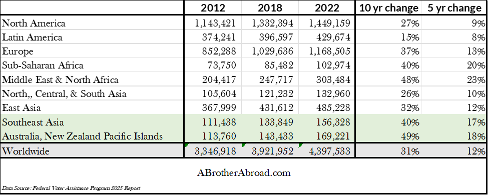 In the decade up to 2022, Southeast Asia, Australia, New Zealand, and the Pacific Islands saw some of the highest increases in American expats moving in for sunny weather and cheaper living far away from the global geopolitical chaos. Southeast Asia saw 40% more Americans moving to its more welcoming countries, while Australia, New Zealand, and the โnearbyโ islands welcomed 50% more Americans aiming to stay long term.