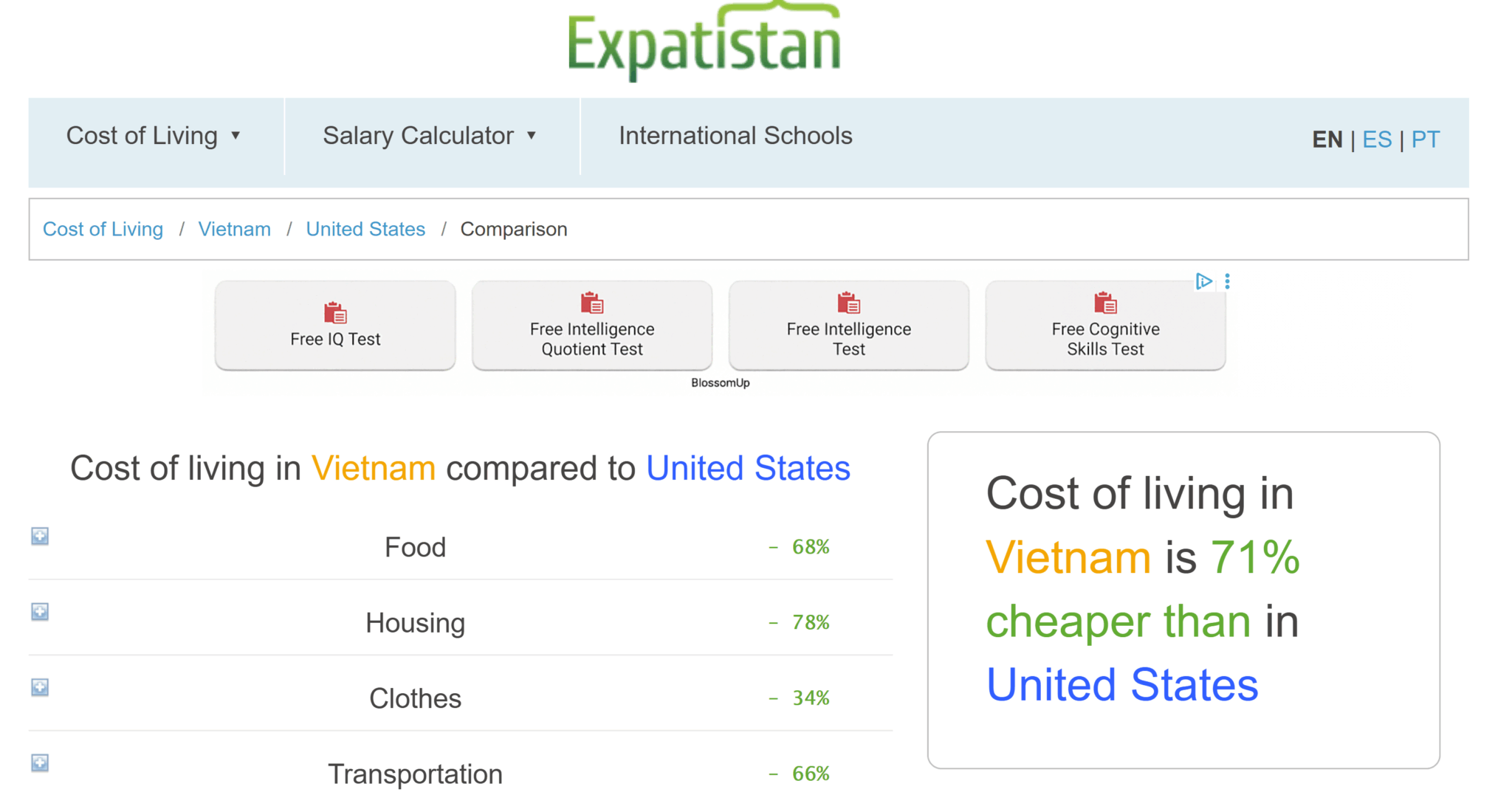 According to Expatistan, the cost of living, on average, in Vietnam is 71% cheaper than the average cost of living in the US. This means that in Vietnam, the cost of living is only 29% of the cost of living in the US (100%-71%=29%), and 29% will be our cost of living adjustment factor when comparing expenses and our FIRE Number in the US to our ExpatFIRE number in Vietnam.