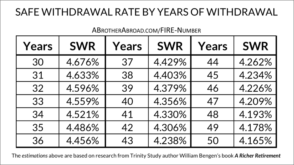 The chart below lists the “safe withdrawa rates” to use (how much of your assets you can safely withdraw each year) aligned with how many years you can expect the assets to last at that chosen rate.